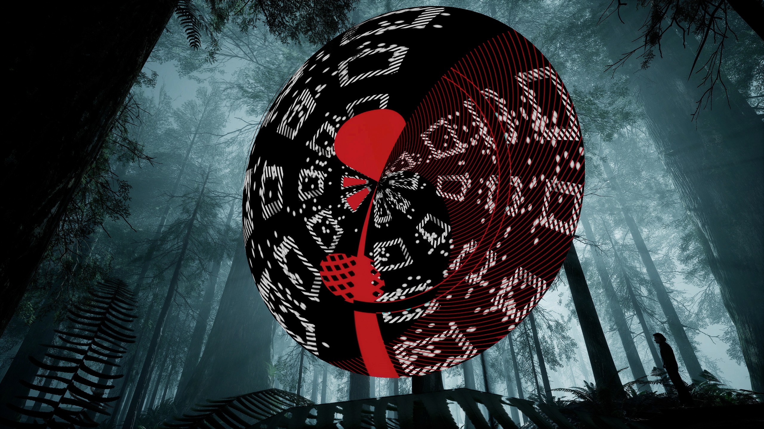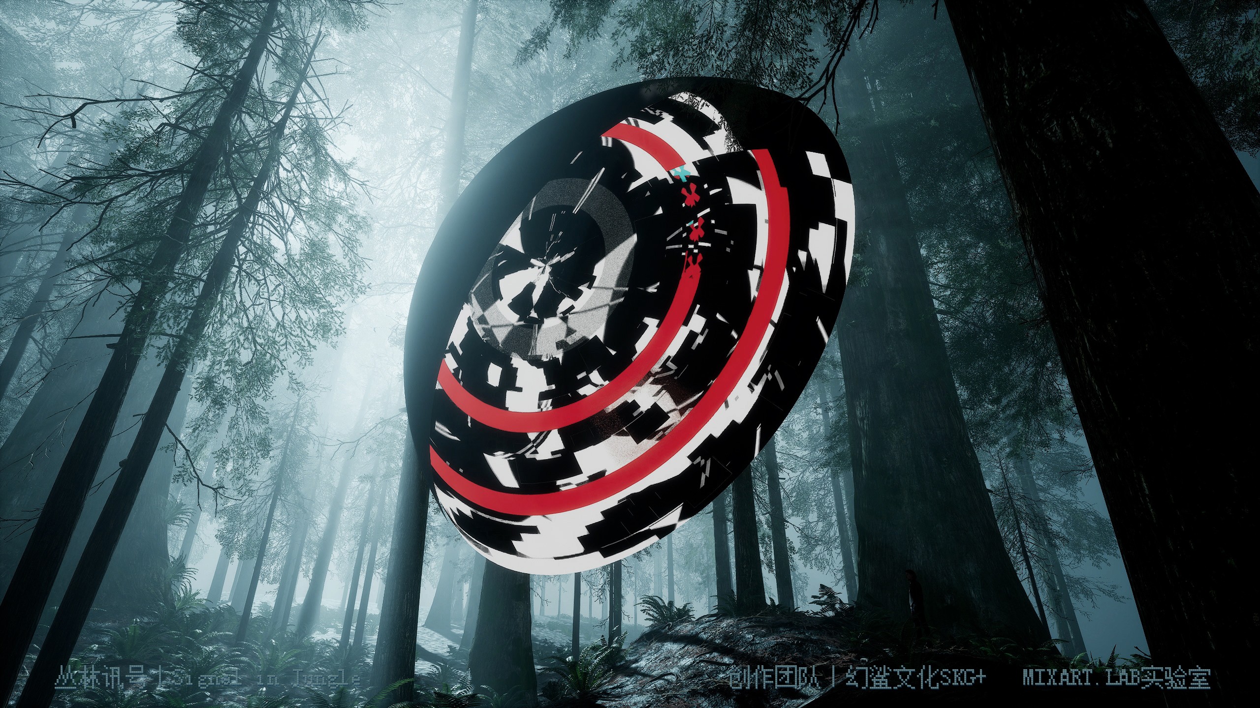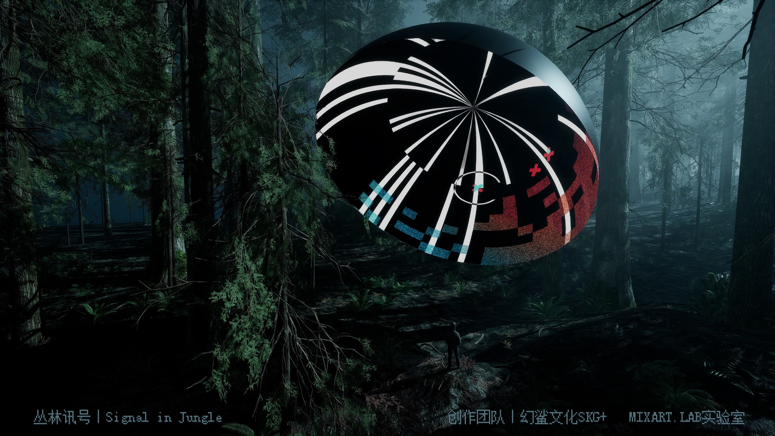 这部作品旨在讨论人类科技与自然的关系,将环境设置在原始丛林中,标准的半圆载体不断闪烁着代表了人类的科技产物的数字讯号,两者的有趣结合像是一场关于共生的讨论。计算机生成的综合图像模拟着数据讯号,网格数据和光效作为动态视觉元素展现,观众得以在丛林中体验在现实空间中无法呈现的时间维度,感受数字讯号与原始丛林结合的特殊视觉效果,以人造光连接自然色彩与人为构成,整一个设置的场域场域结合了人、机、环境,叠加了虚拟与现实,成为了人类科技与自然关系的投射。