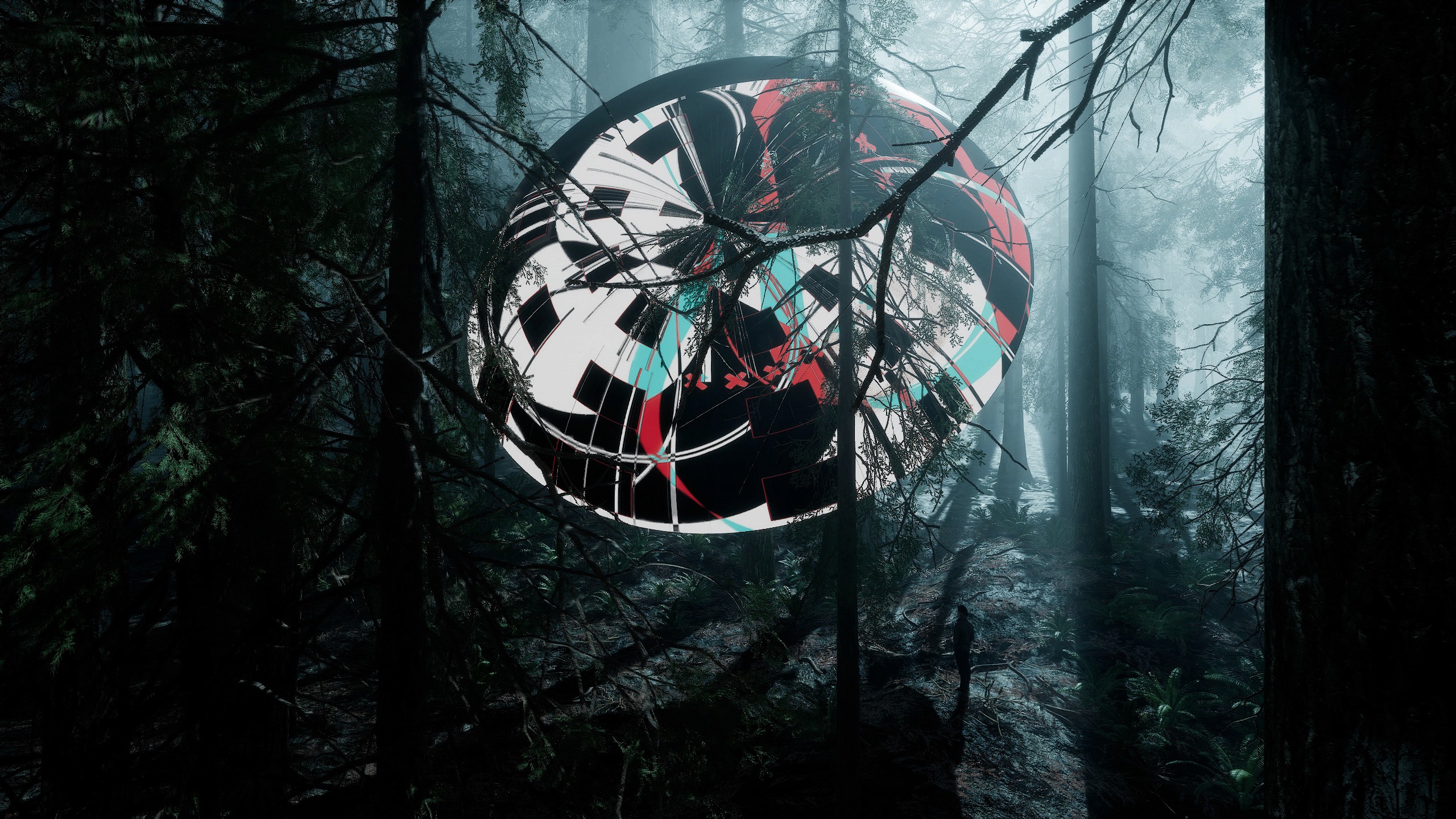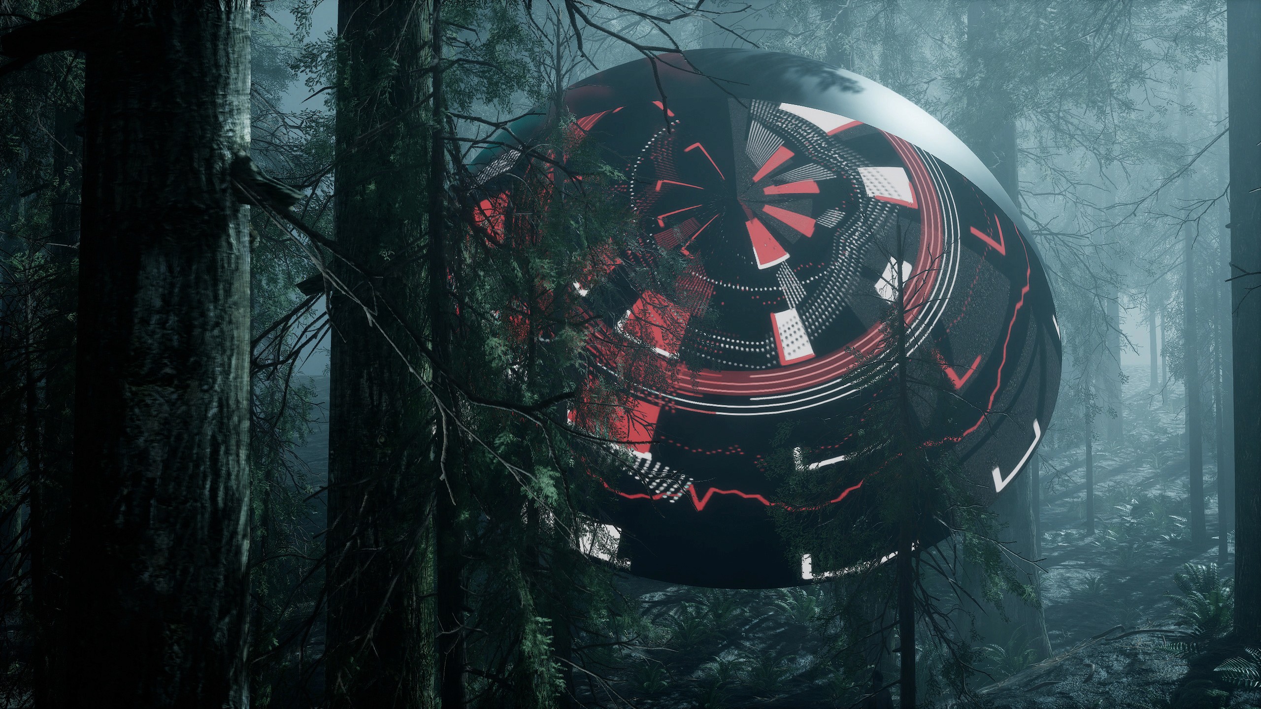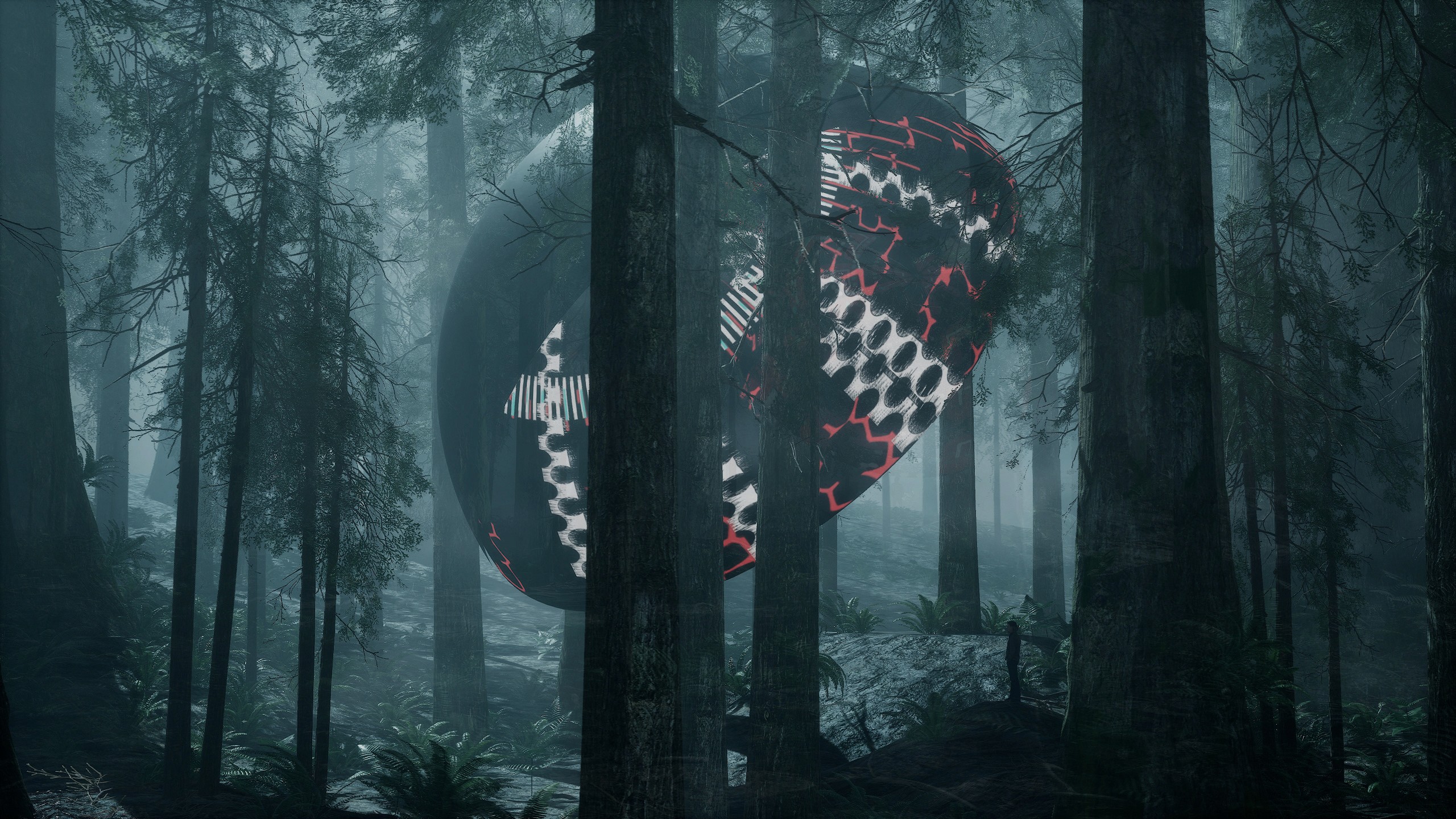 这部作品旨在讨论人类科技与自然的关系,将环境设置在原始丛林中,标准的半圆载体不断闪烁着代表了人类的科技产物的数字讯号,两者的有趣结合像是一场关于共生的讨论。计算机生成的综合图像模拟着数据讯号,网格数据和光效作为动态视觉元素展现,观众得以在丛林中体验在现实空间中无法呈现的时间维度,感受数字讯号与原始丛林结合的特殊视觉效果,以人造光连接自然色彩与人为构成,整一个设置的场域场域结合了人、机、环境,叠加了虚拟与现实,成为了人类科技与自然关系的投射。