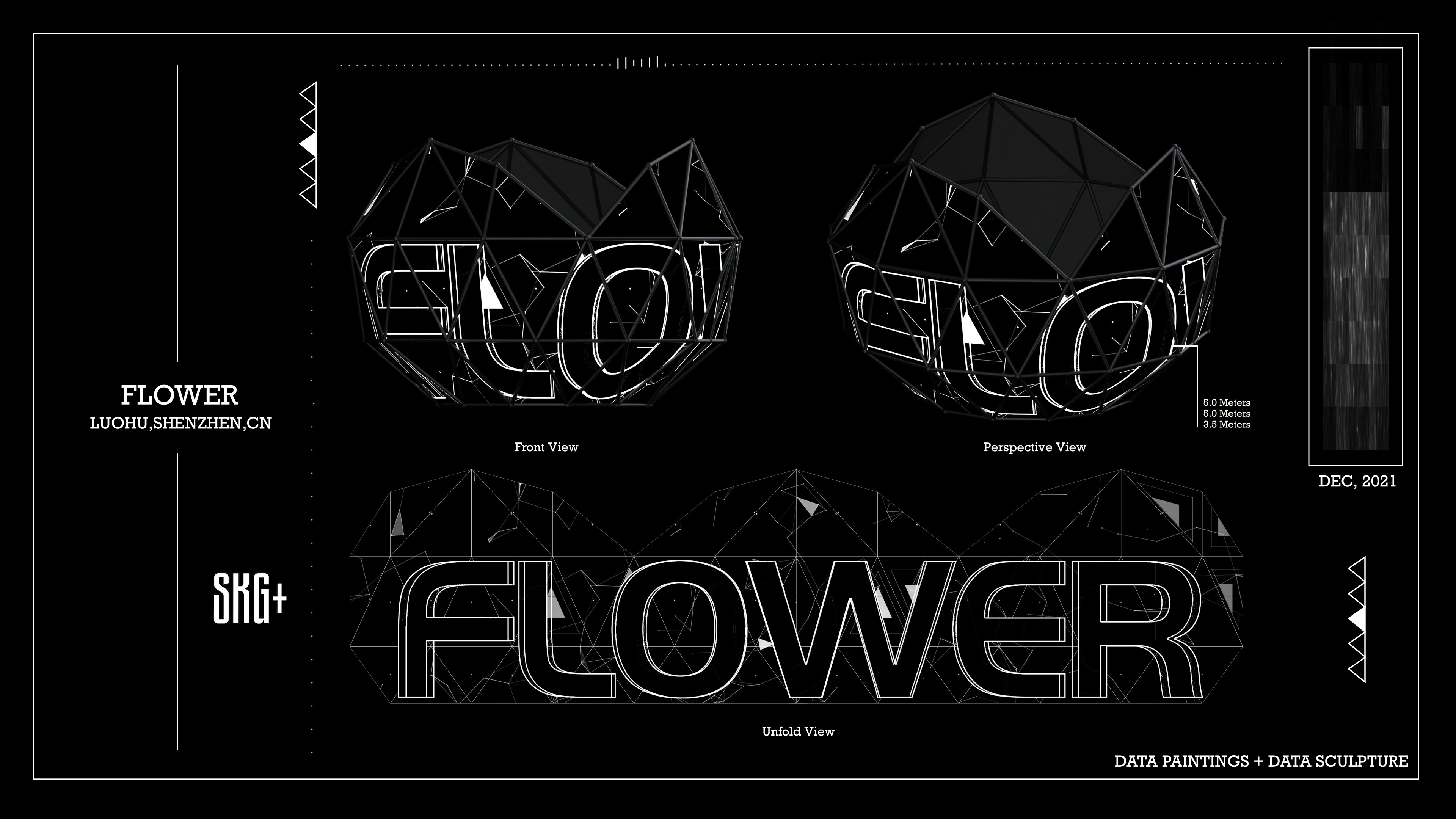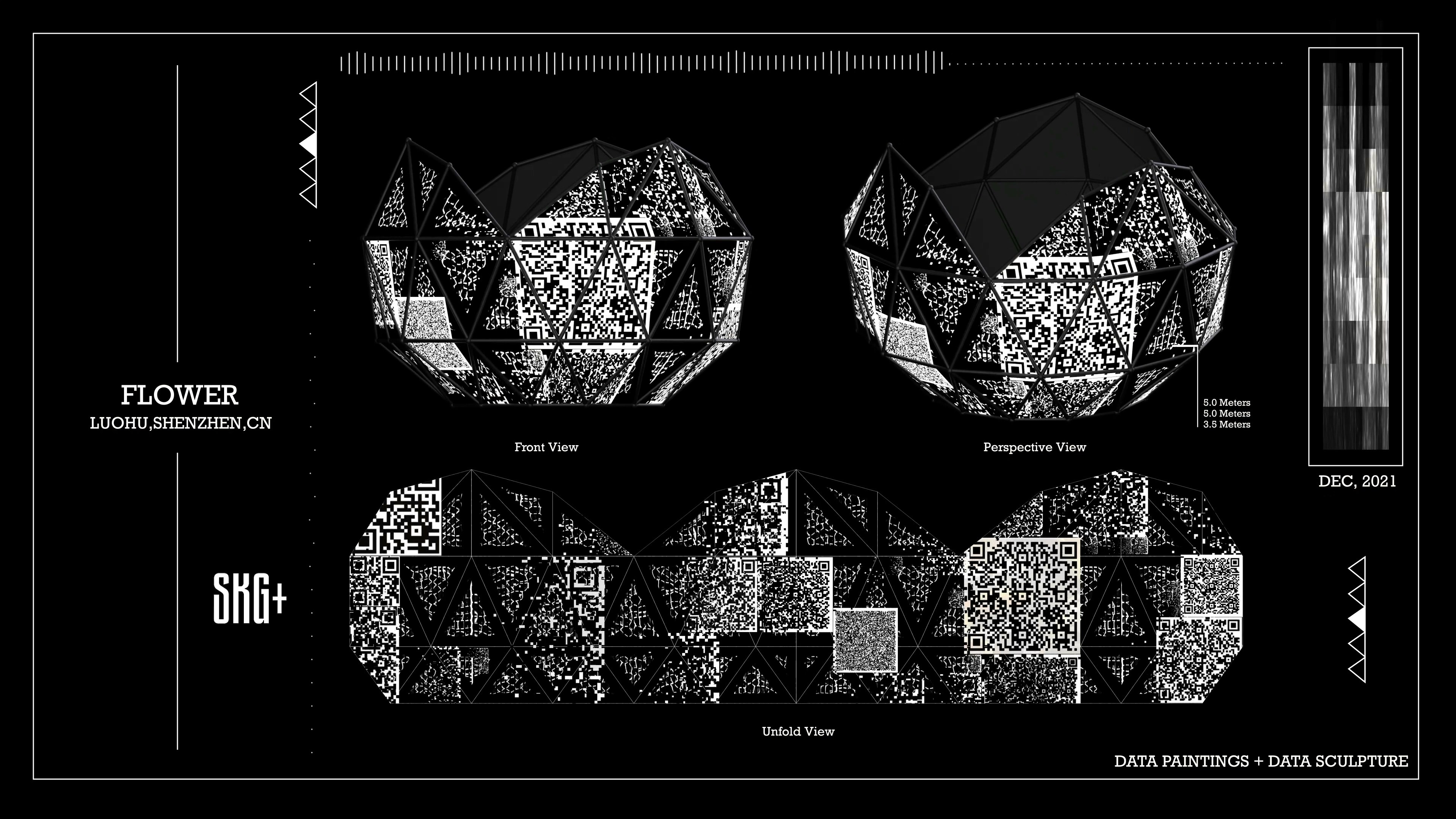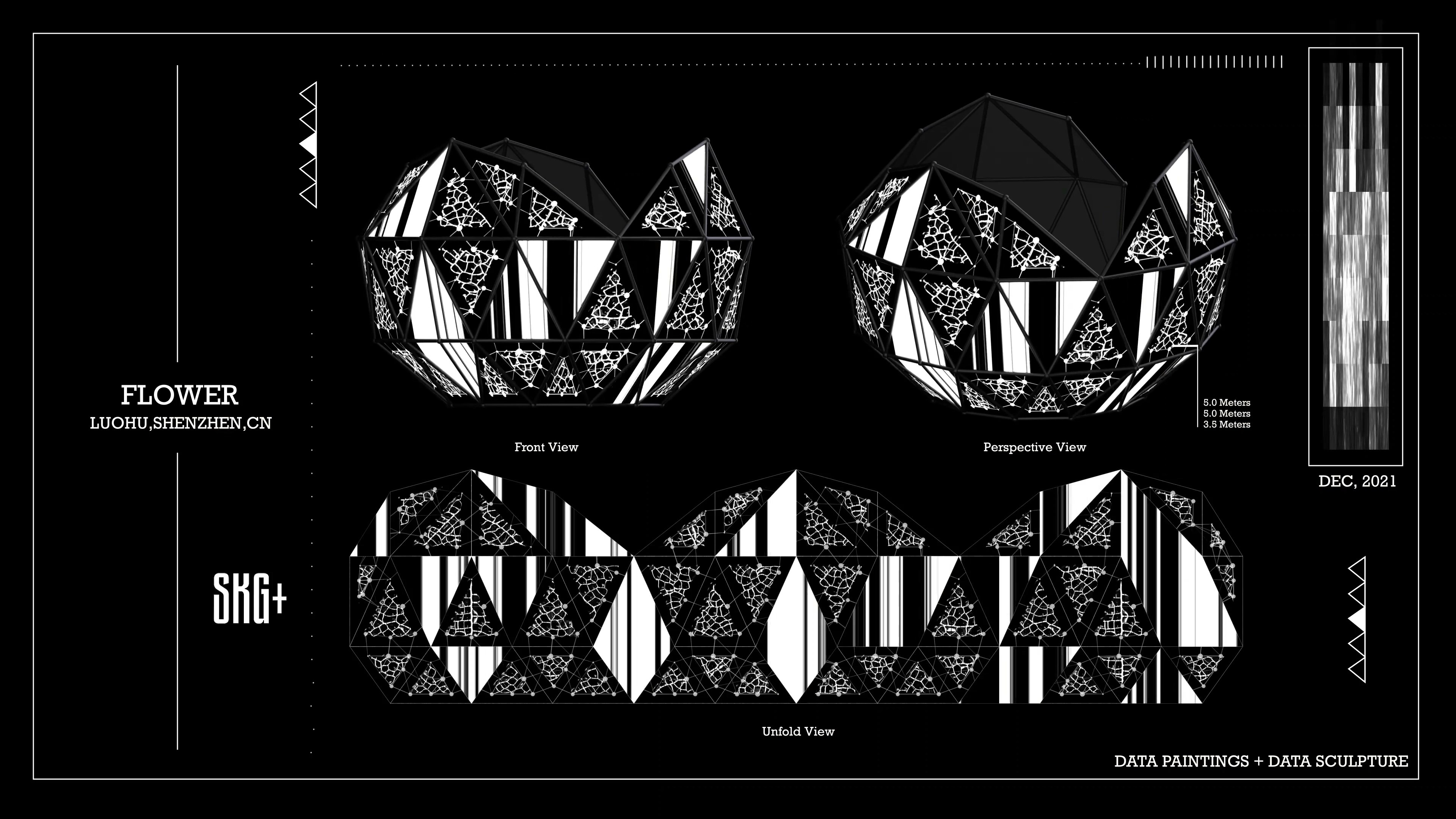 这件名为《FLOWER》的艺术装置作品,以数据雕塑的方式在深圳罗湖呈现。整体造型宛如一朵绽放的花朵,由多个几何切面构成,每个切面都仿佛花瓣般展开,映射出黑与白的交错图像。设计中融入了数据可视化的逻辑,密集的线条与块面营造出节奏感与张力,使雕塑在视觉上具有强烈的动态感。装置表面投射的黑白信息如同数据流的切片,既冷峻又诗意,象征着信息社会下复杂而精密的结构。观者在不同角度下观看,会感受到图案的不断变化,仿佛数据本身在呼吸与流动。这种交错的光影与几何结构的结合,不仅突出了信息的重要性,也赋予雕塑以多层次的解读空间。通过这种实验性与时尚感兼具的设计,《FLOWER》为城市空间注入了一种新的语言。它不仅是数据与雕塑的融合,更是一种思考媒介,邀请人们在光影与信息的交织中重新感知当代生活的复杂与美感。