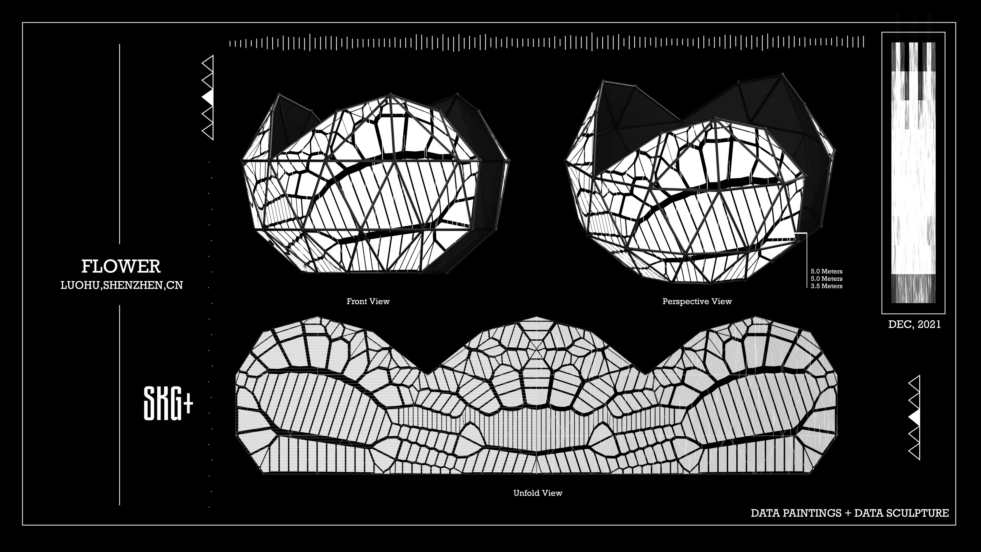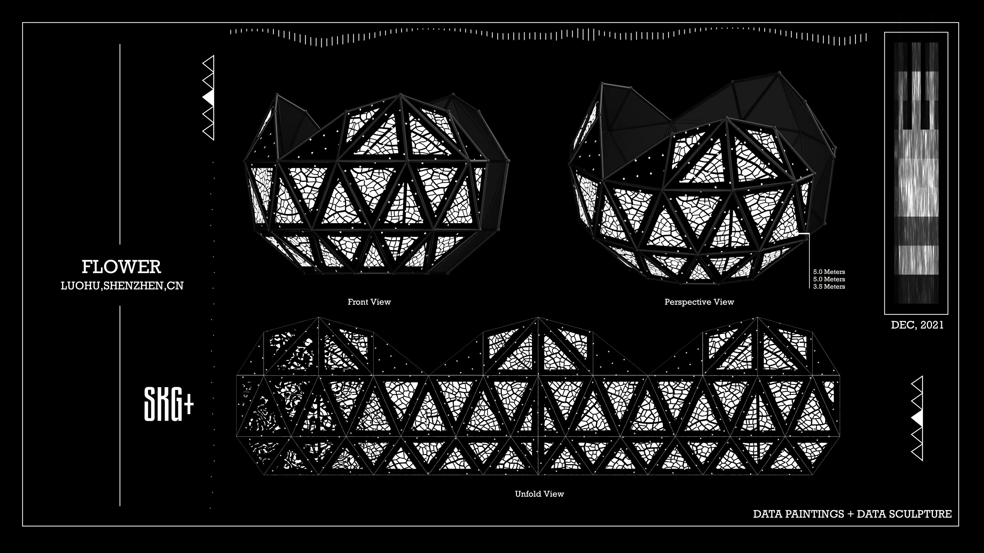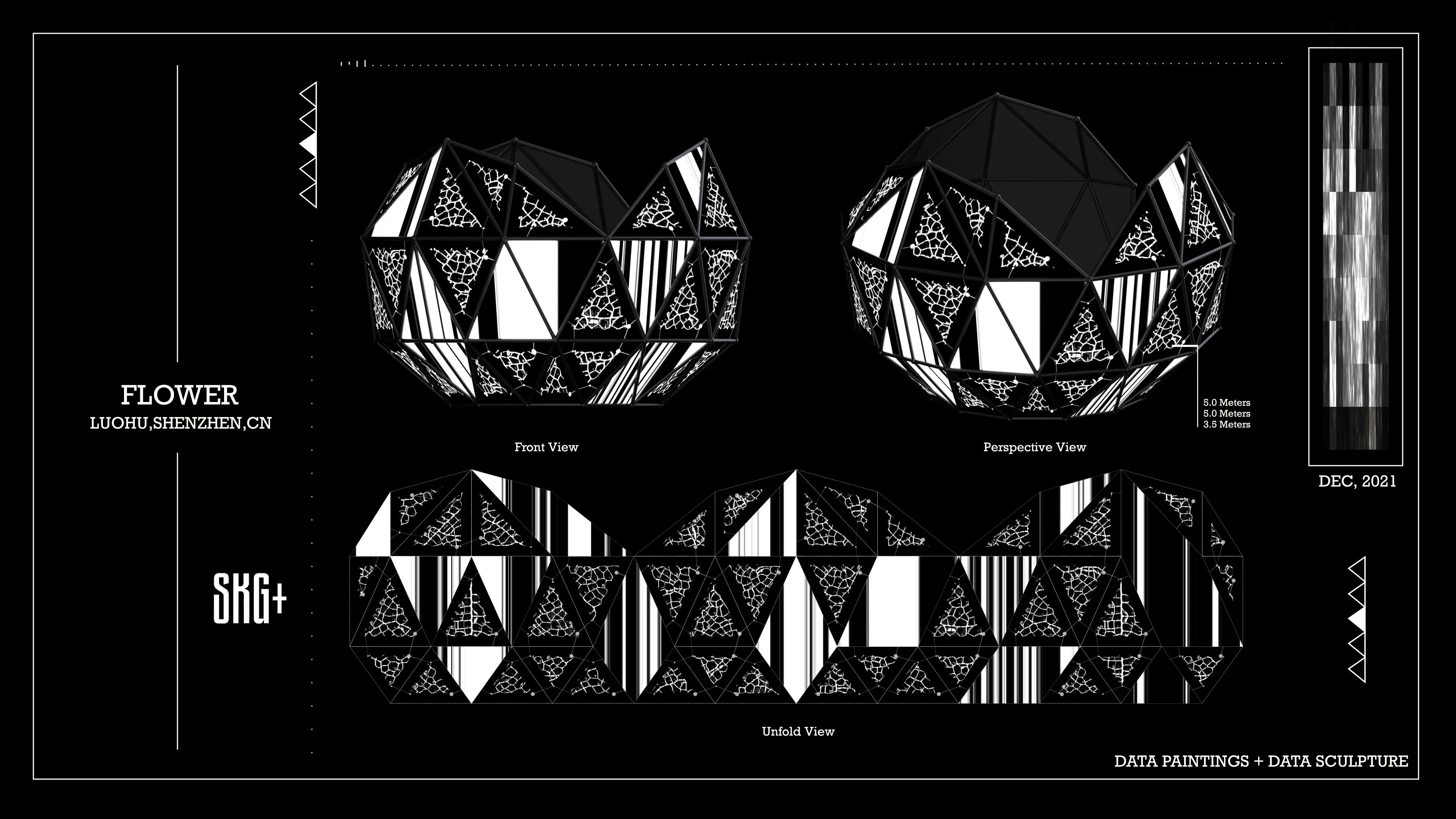 这件名为《FLOWER》的艺术装置作品,以数据雕塑的方式在深圳罗湖呈现。整体造型宛如一朵绽放的花朵,由多个几何切面构成,每个切面都仿佛花瓣般展开,映射出黑与白的交错图像。设计中融入了数据可视化的逻辑,密集的线条与块面营造出节奏感与张力,使雕塑在视觉上具有强烈的动态感。装置表面投射的黑白信息如同数据流的切片,既冷峻又诗意,象征着信息社会下复杂而精密的结构。观者在不同角度下观看,会感受到图案的不断变化,仿佛数据本身在呼吸与流动。这种交错的光影与几何结构的结合,不仅突出了信息的重要性,也赋予雕塑以多层次的解读空间。通过这种实验性与时尚感兼具的设计,《FLOWER》为城市空间注入了一种新的语言。它不仅是数据与雕塑的融合,更是一种思考媒介,邀请人们在光影与信息的交织中重新感知当代生活的复杂与美感。