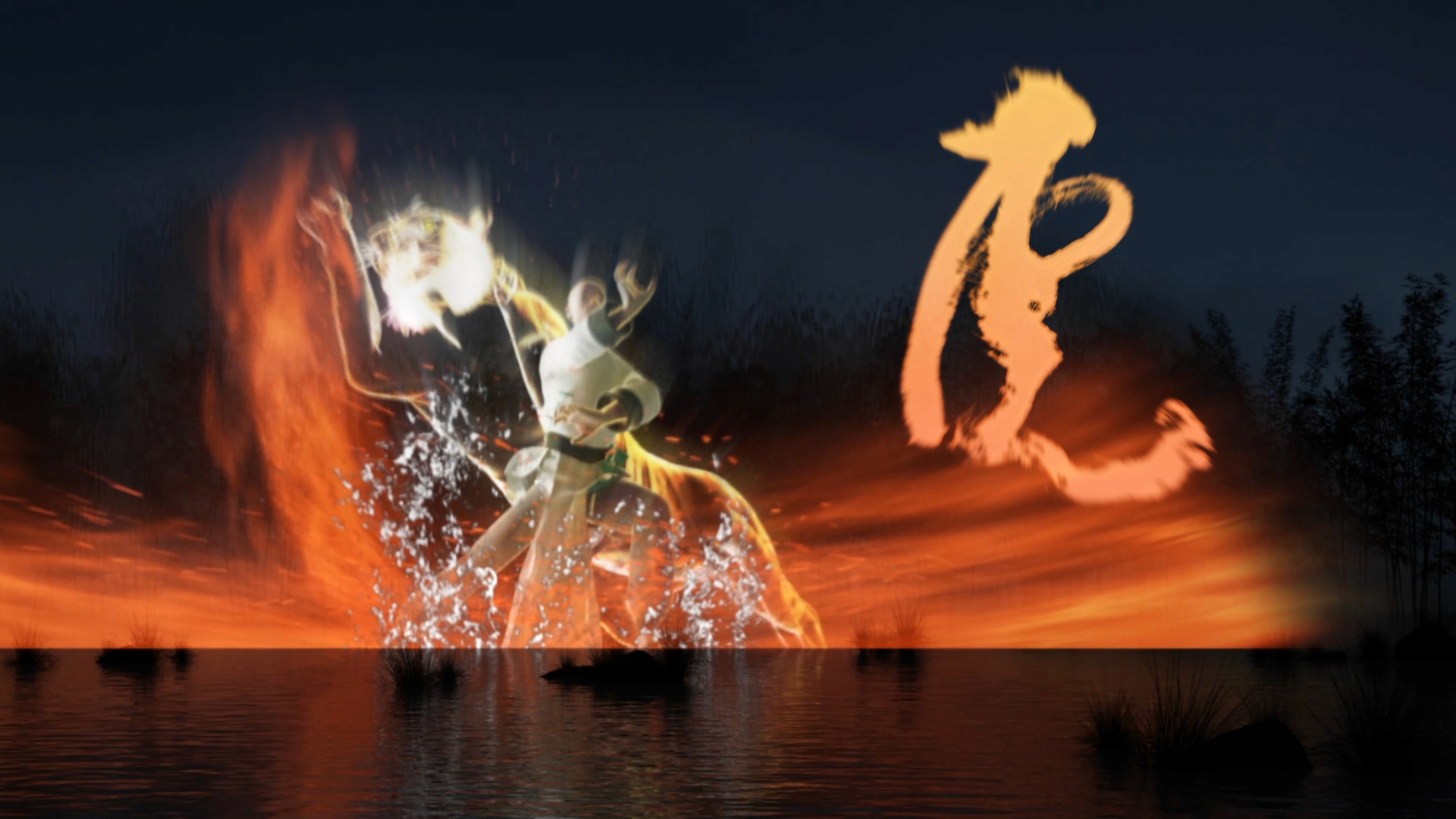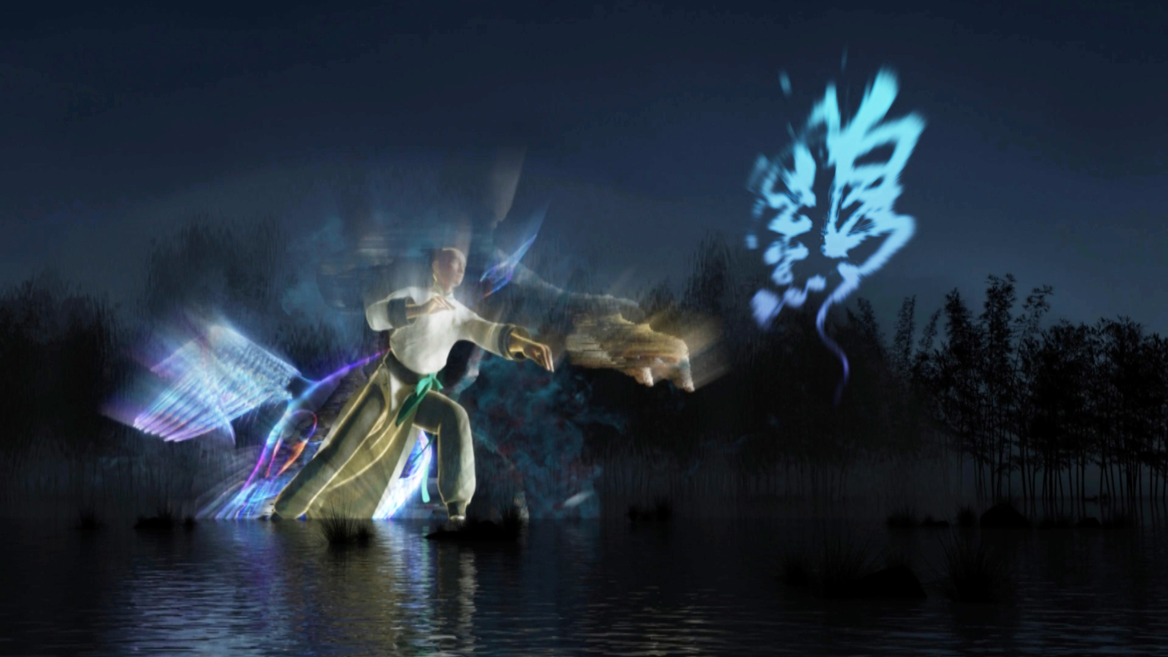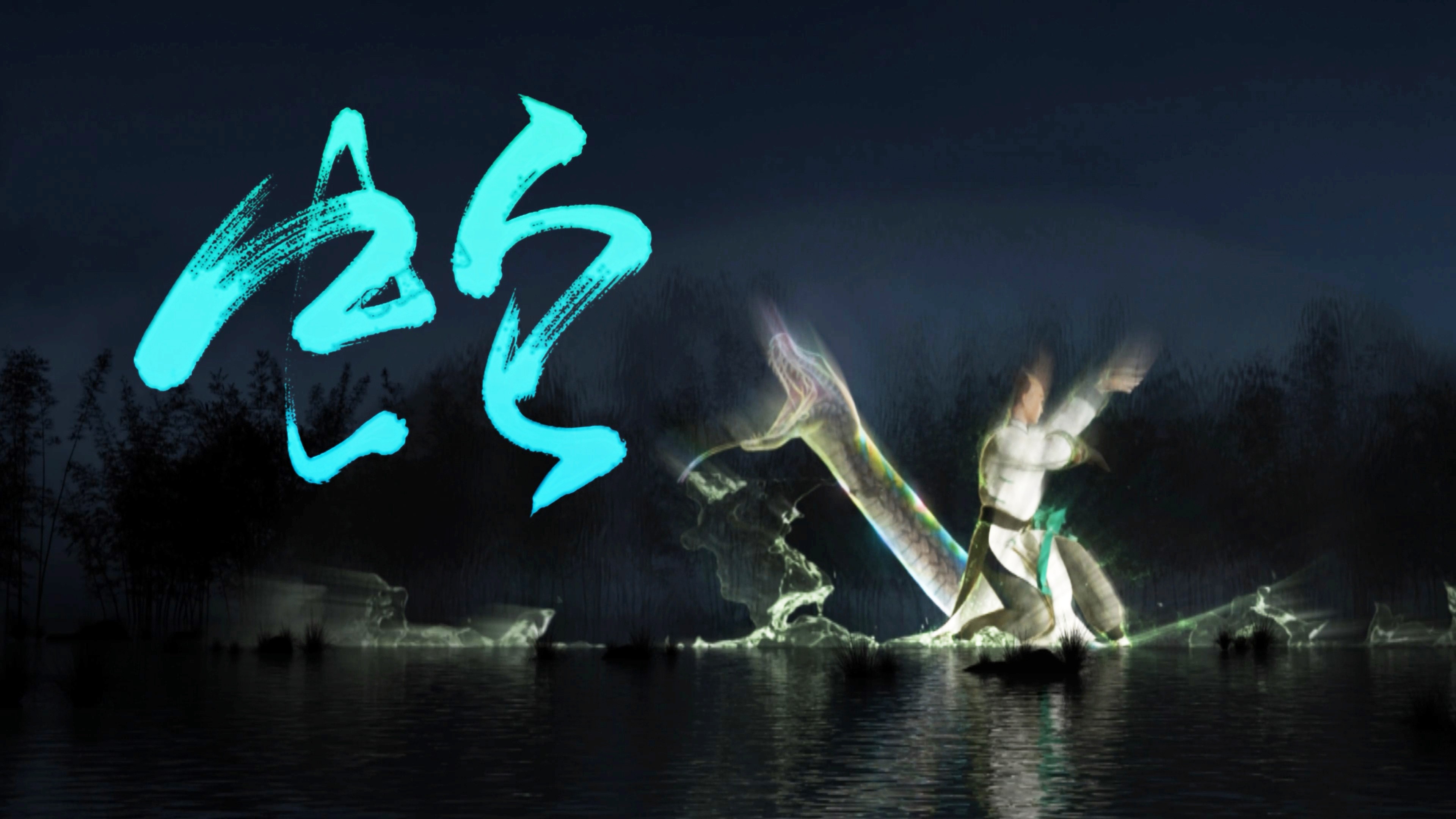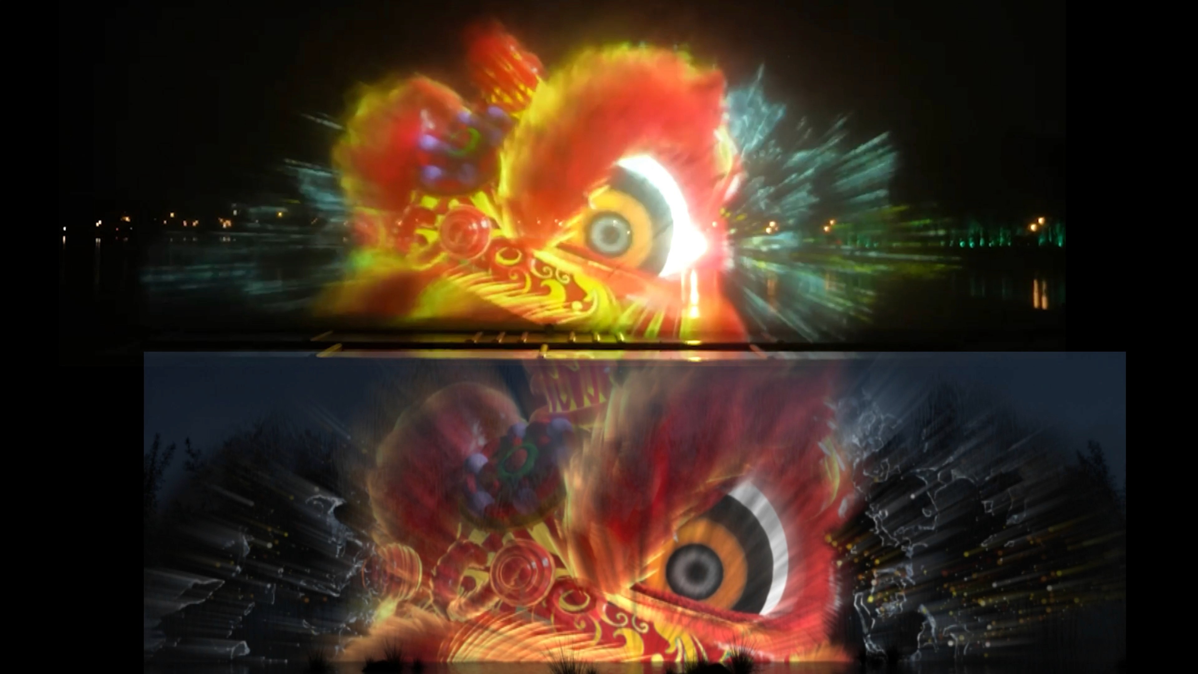 本作品由广州明道与深圳幻鲨联合制作,主创团队结合当地文化习俗,建筑特色,历史事件和艺术风格融合贯通在竹映洪拳的故事中,全篇共7幕创意章节,总时长450秒,共有40多个特效镜头画面。团队紧密配合,利用独具创新的故事情节和一丝不苟的匠人精神,经历4个月相互协调、精心雕琢,从色彩、氛围、影像、五感、体验等不同角度协同造境,将竹韵与洪拳的文化脉络与演绎手段相碰撞,暗相呼应。为大家呈现了竹映洪拳这一水幕大秀。作品从“洪拳发轫地,修竹隐洞天”破题,以水为卷,以竹为韵,以拳为意。开辟洞天世界,再现百年前的花山巴水。在诗化的光影声色中,娓娓道来洪拳泰斗:洪熙官大隐于市,博采众长,在花县创宗立派的故事。