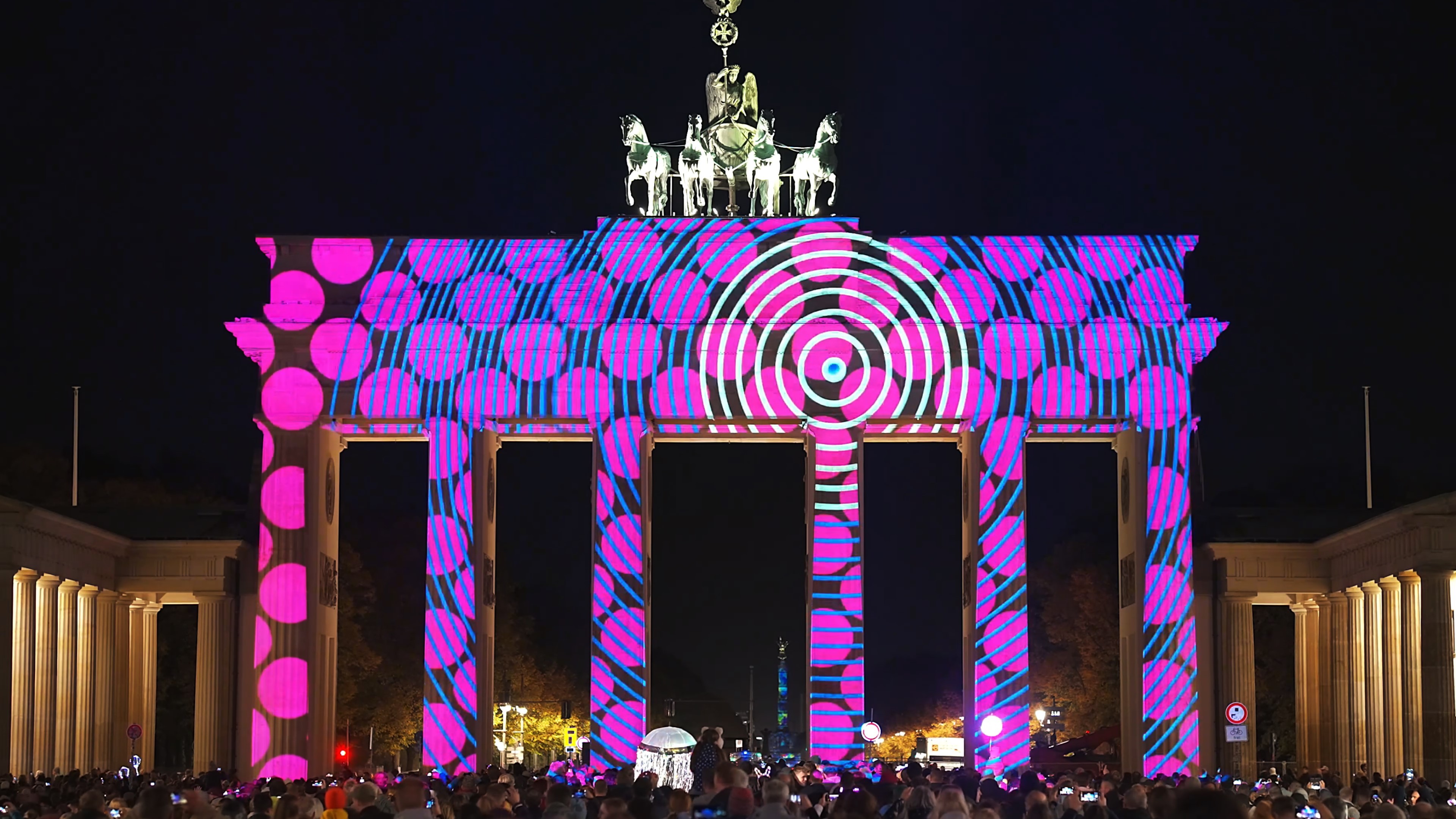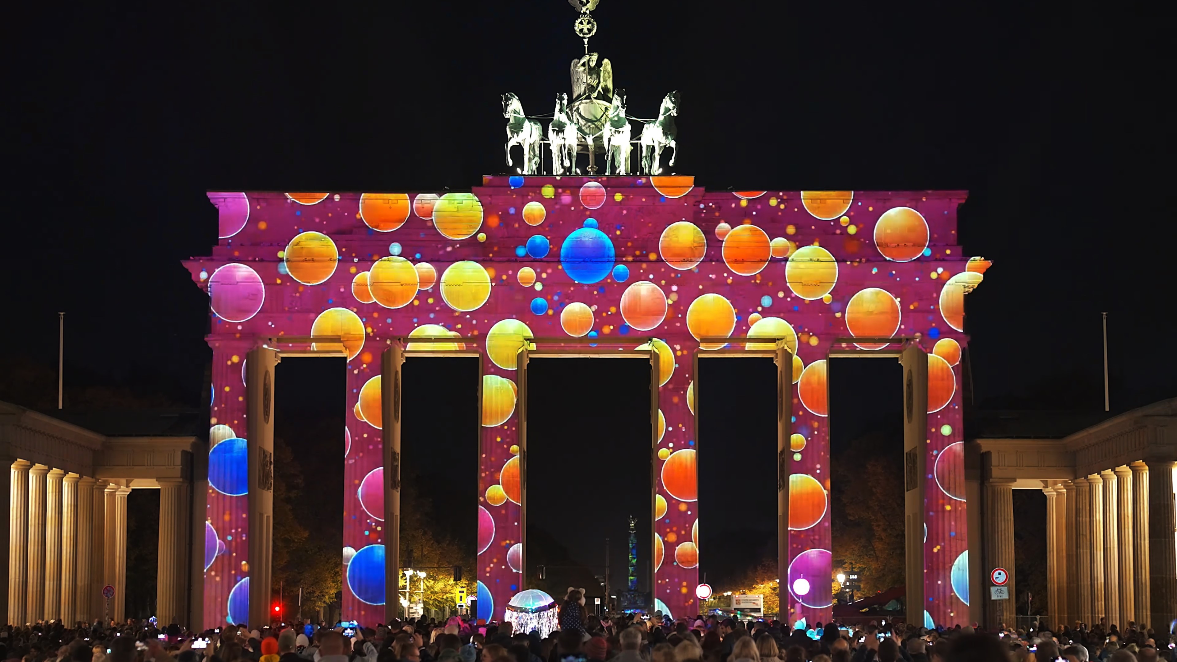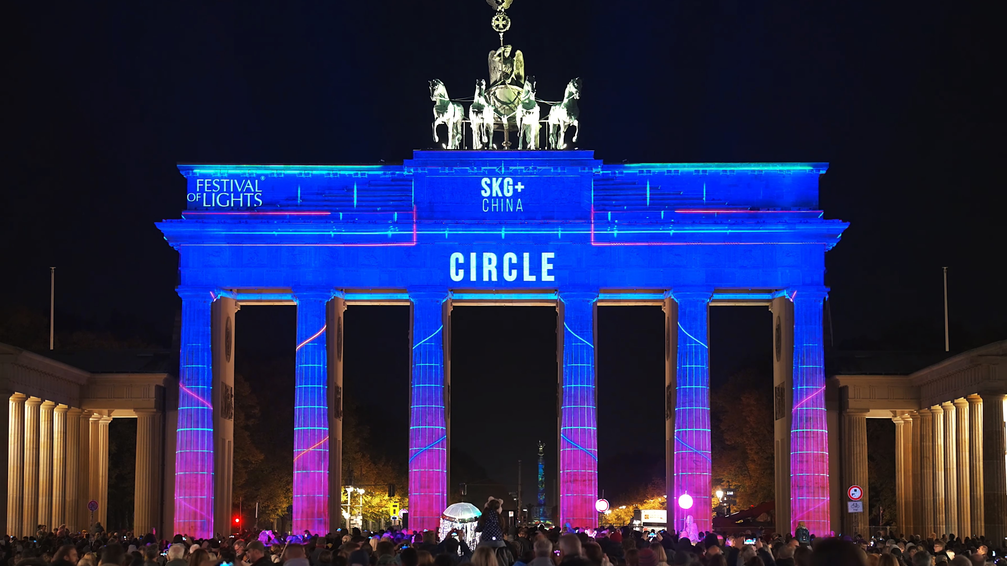 作品《圆》于2024年柏林灯光节勃兰登堡门上演。圆是一个伟大的图形,不仅在形态上具备包容性与完整性,还象征着完美、循环、团圆、团结与和谐。圆形在不同文化中都被视为团结与和谐的象征:如中国节日中的汤圆和月饼,寓意家庭的团聚与吉祥;古希腊的圆形庙宇和剧场,体现他们对完美与对称的追求;北欧神话中的圆形符文,则代表宇宙的循环与世界的连接。在现代社会亦如此,圆在数学与科学中代表重要的节点与连接点,在艺术与设计中赋予作品平衡感与视觉张力。圆同时传达着个体之间的联系与依赖,象征着社区与社会的团结与和谐。圆也寓意生命的轮回。我们在2023年柏林灯光节的作品,表达了对逝去生命的敬畏;而今年,因为我的宝宝即将降生,我又联想到生命的诞生。所以整部作品也围绕“生命”展开叙述:生命是人类最伟大的奇迹与光芒。在表现手法上,我们结合二维与三维的视觉形式,以圆为唯一的基本元素,通过颜色、大小、粗细等变化,营造出丰富的视觉层次。正如人类有着不同的性别、人种、信仰,不同的圆形也彼此关联:蓝色与黄色圆形叠加,生成新的绿色;小圆虽在面积上远小于大圆,却依旧保持完整。最终,当所有圆融合在一起时,便展现出一种完美的整体,传达团结与和谐的美好愿景。