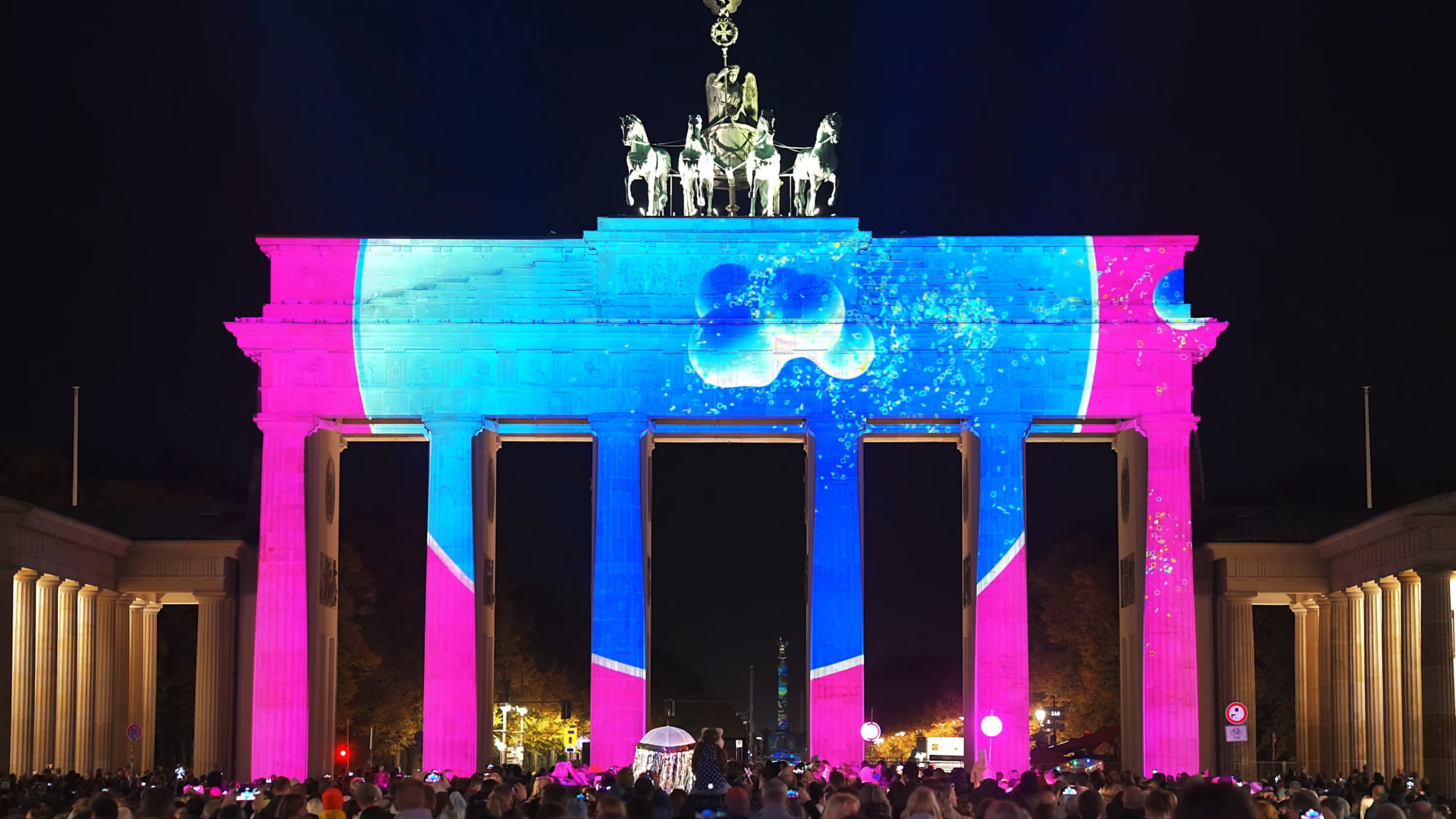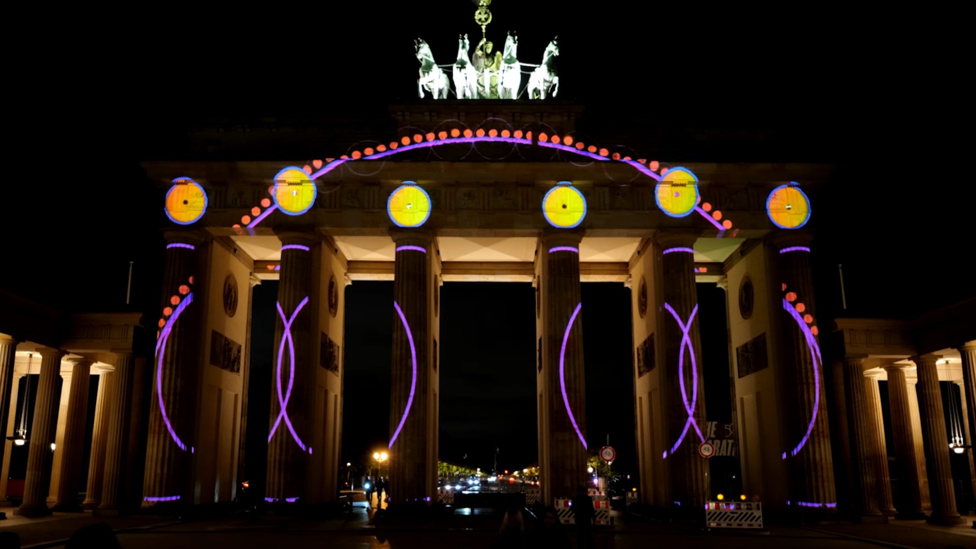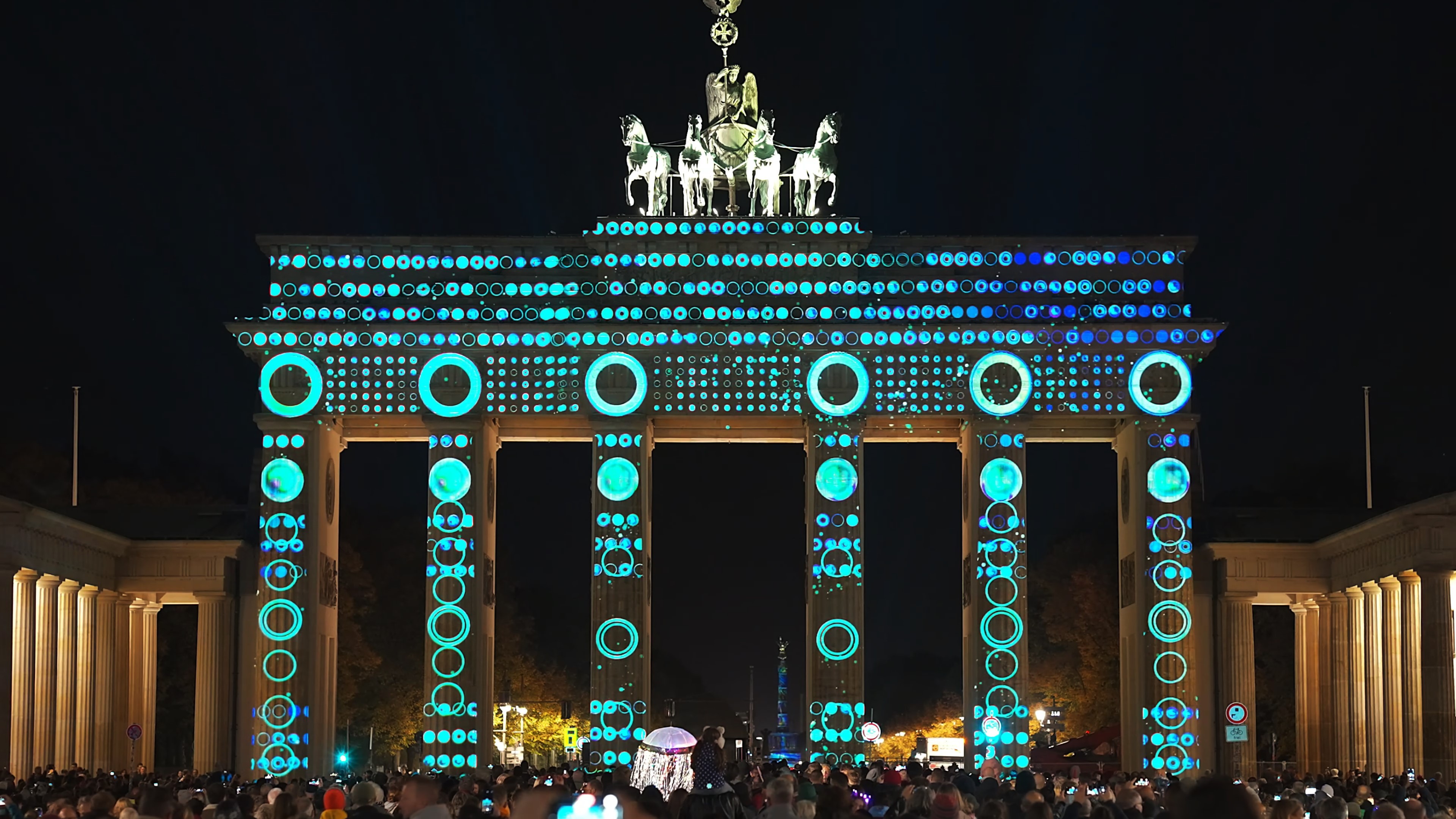 作品《圆》于2024年柏林灯光节勃兰登堡门上演。圆是一个伟大的图形,不仅在形态上具备包容性与完整性,还象征着完美、循环、团圆、团结与和谐。圆形在不同文化中都被视为团结与和谐的象征:如中国节日中的汤圆和月饼,寓意家庭的团聚与吉祥;古希腊的圆形庙宇和剧场,体现他们对完美与对称的追求;北欧神话中的圆形符文,则代表宇宙的循环与世界的连接。在现代社会亦如此,圆在数学与科学中代表重要的节点与连接点,在艺术与设计中赋予作品平衡感与视觉张力。圆同时传达着个体之间的联系与依赖,象征着社区与社会的团结与和谐。圆也寓意生命的轮回。我们在2023年柏林灯光节的作品,表达了对逝去生命的敬畏;而今年,因为我的宝宝即将降生,我又联想到生命的诞生。所以整部作品也围绕“生命”展开叙述:生命是人类最伟大的奇迹与光芒。在表现手法上,我们结合二维与三维的视觉形式,以圆为唯一的基本元素,通过颜色、大小、粗细等变化,营造出丰富的视觉层次。正如人类有着不同的性别、人种、信仰,不同的圆形也彼此关联:蓝色与黄色圆形叠加,生成新的绿色;小圆虽在面积上远小于大圆,却依旧保持完整。最终,当所有圆融合在一起时,便展现出一种完美的整体,传达团结与和谐的美好愿景。