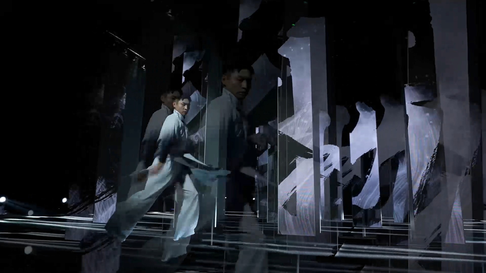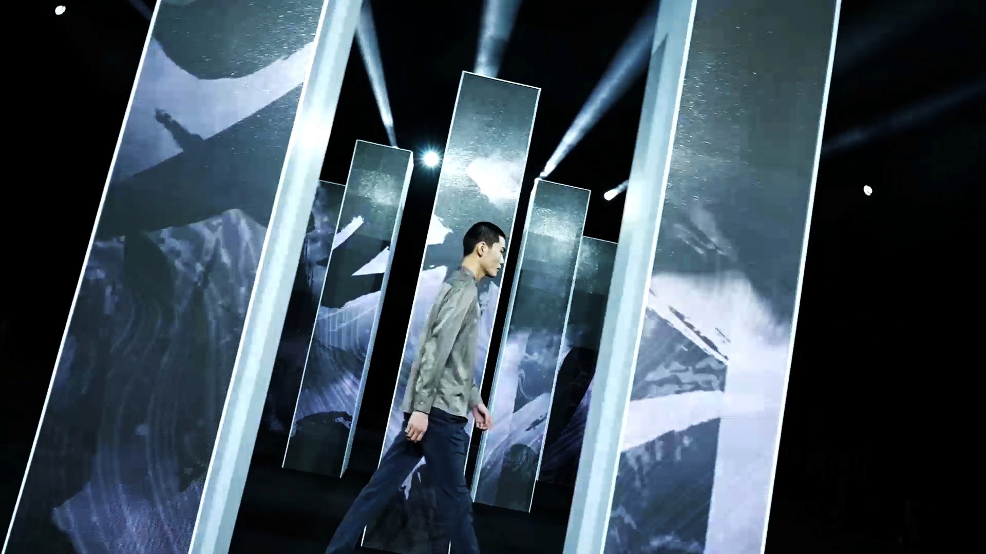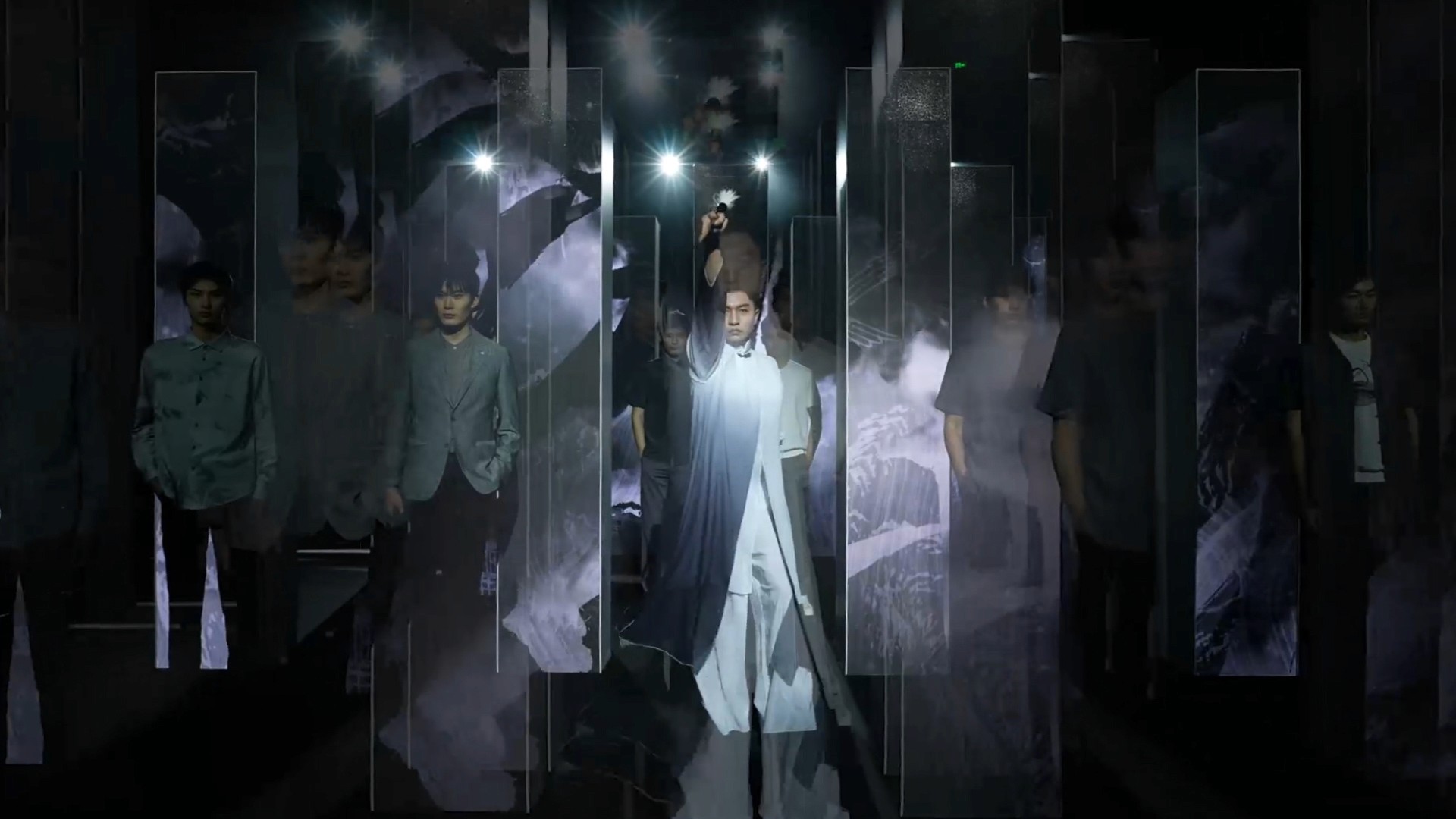 在威可多VICUTU的新品发布会上,我们在由20多根立柱组成的走秀舞台上,创作了中式水墨山水意境的数字艺术。将丹顶鹤三个字的笔划融入到背景的水墨山水中,黑、白、灰三色勾勒出空灵幽美的国风意境。红色代表丹顶鹤,黑白象征山水,山海间的流淌呈现抽象之美。国画“泼墨”手法与数字手段相结合,表现出烟云中鹤飞带起粒子的拖尾,寓意着高古之美。最后,黄金时代的色彩华丽,立体水墨粒子如太阳般炫光四射,记录这个最美好的时代。这数字艺术作品展现了丰富多彩的中国山水文化,与VICUTU品牌的时尚气息相得益彰。