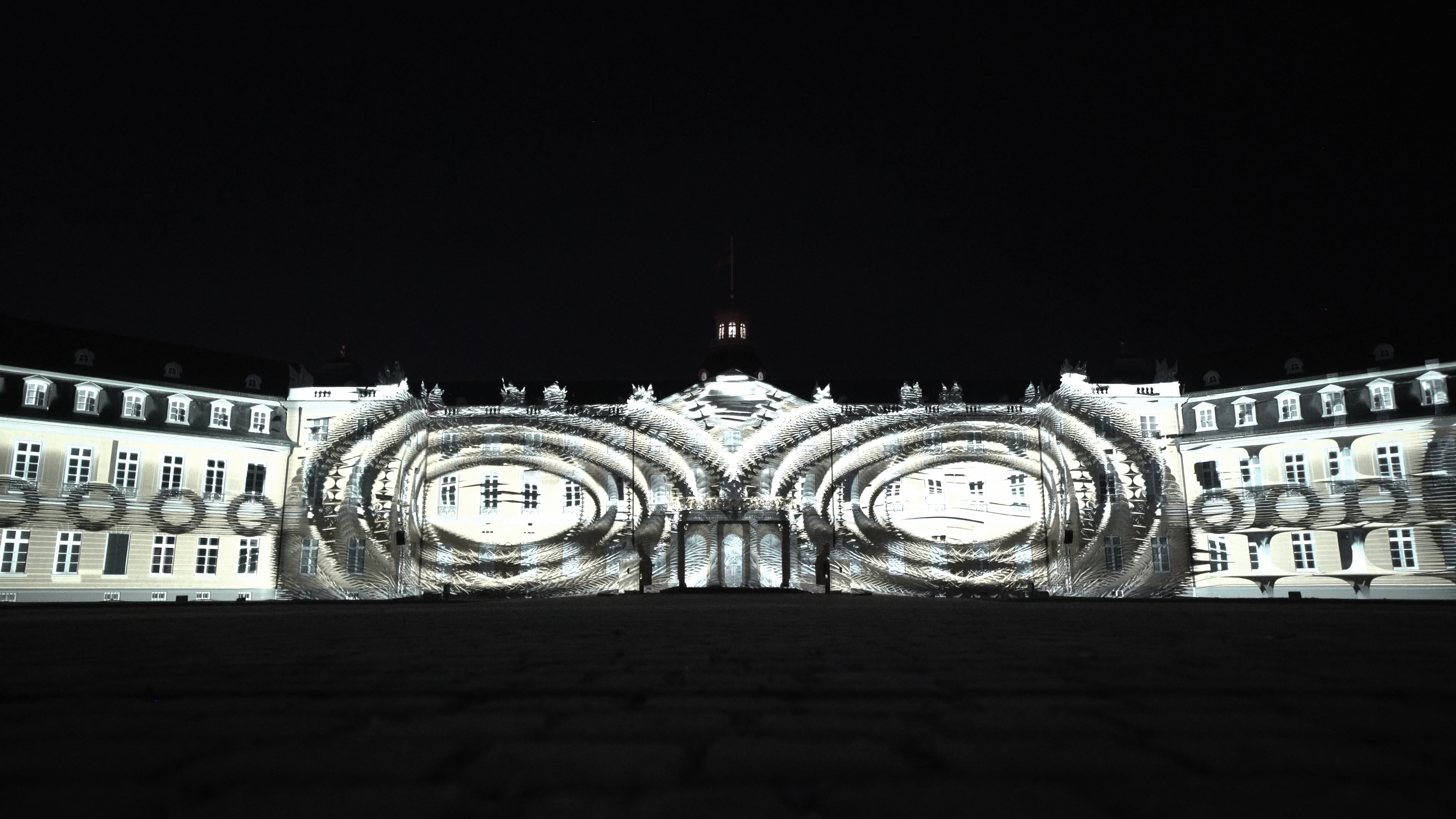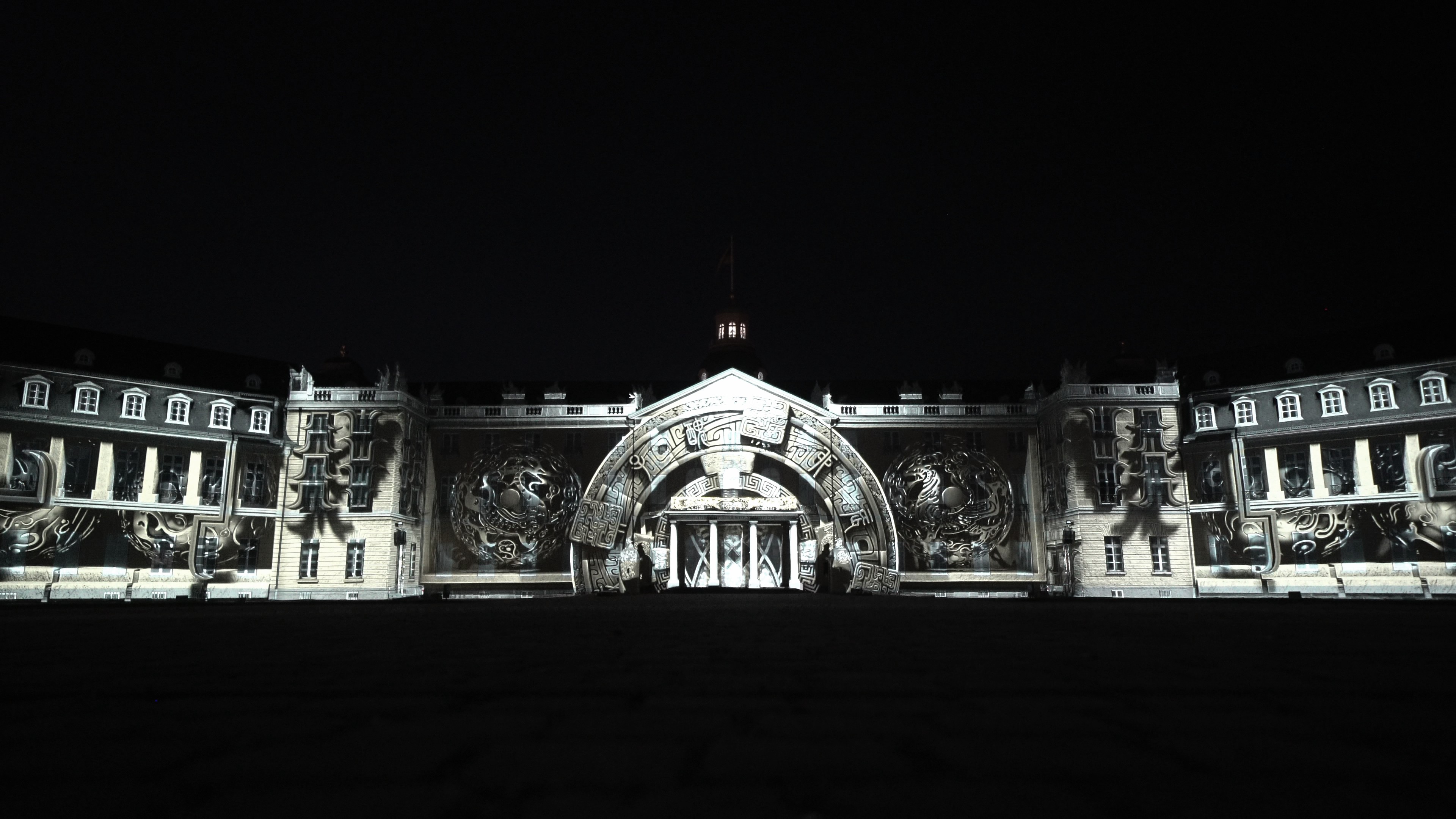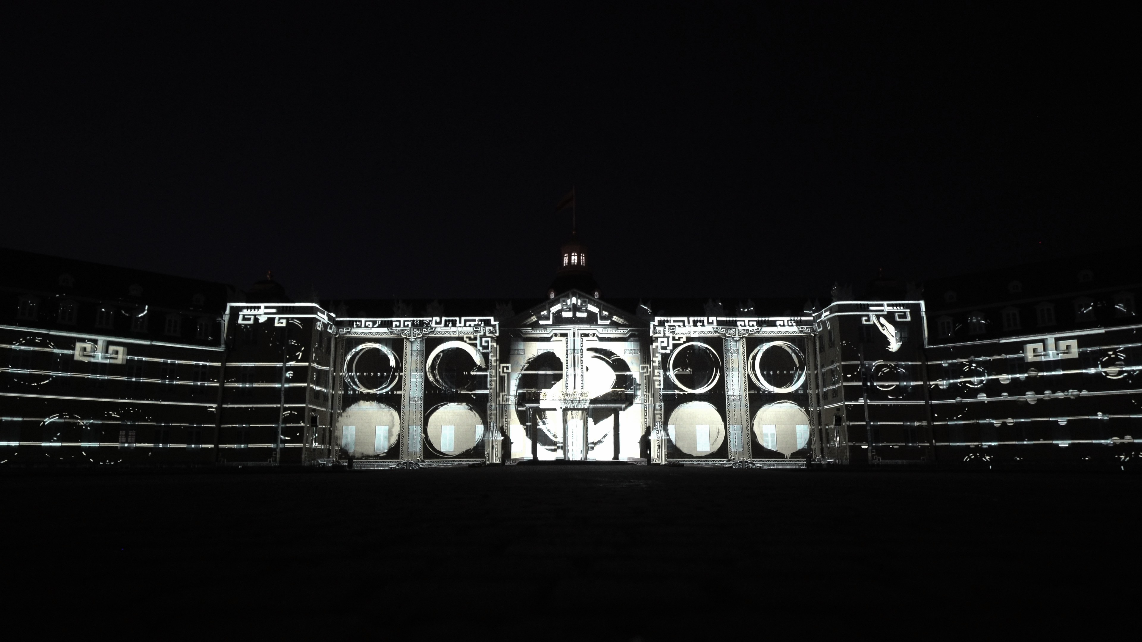 This artwork was exhibited in 2025 at the Schlosslichtspiele in Karlsruhe, Germany, organized by ZKM, under the title The Tao · The Flow of Universe. Rooted in the visual foundation of ink painting, it merges the Tao from Eastern philosophy with the rational logic of Western modern science, seeking to establish a new form of visual narrative. The blankness and fluidity of ink are used as metaphors for cosmic operation and scientific evolution, unfolding imagery of time, energy, and the cycle of life.The design employs large amounts of abstract particle structures, vortex lines, and waveforms, symbolizing scientific concepts such as the quantum world, gravitational waves, and energy fields. Black and gold collisions, folded arcs, and rotating totems in the visuals respond to modern physics` exploration of the structure of the universe. These images are not mechanical reproductions of real scientific devices but a perception of their existence and logic through the sensibility of Eastern ink painting, interpreting rigid knowledge with flexible brushstrokes.The structure of the artwork follows the principles of symmetry, disruption, and recomposition, echoing the cyclical system of Tao Follows Nature. In the architectural mapping, patterns of circuit boards, the form of Taiji, and celestial trajectories are revealed and resonate with the silhouette of Karlsruhe Palace, blending traditional space with a technological context.In visual language, the artwork draws inspiration from the essence of masters Qi Baishi and Wu Guanzhong, while also referencing the abstract systems of Kandinsky and Mondrian. At the same time, it preserves the brush logic of Eastern calligraphy, water textures, and drifting clouds, allowing the coldness of technology and the poetry of the East to mirror each other within the same frame. Through this artwork, we aim to bridge ink painting and technology, Eastern philosophy and Western science, transforming architecture into a cross-cultural and cross-temporal visual laboratory.