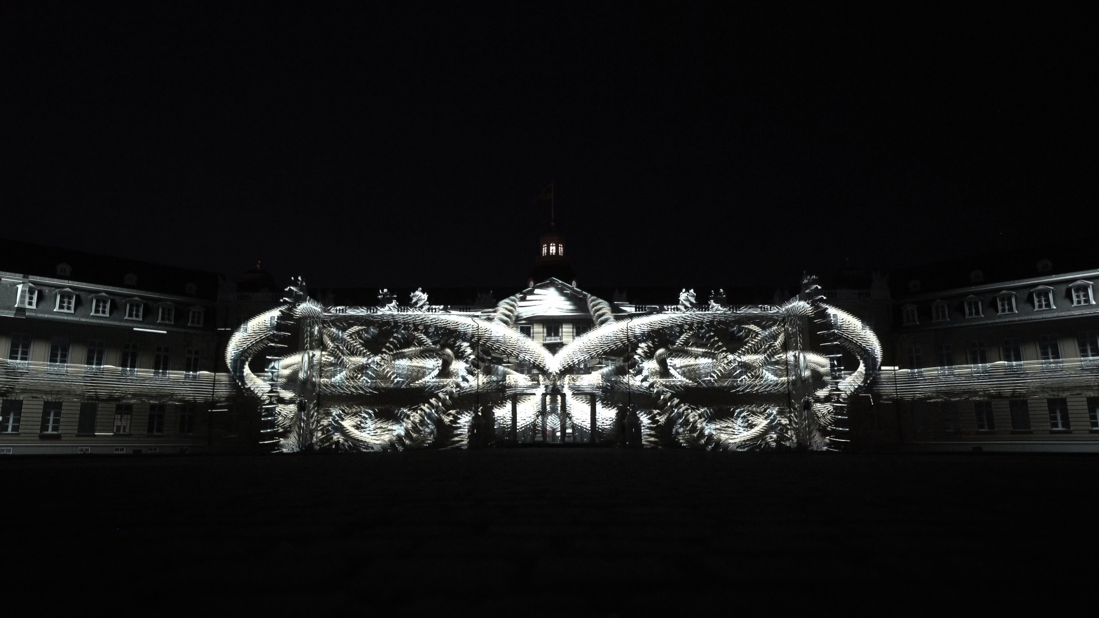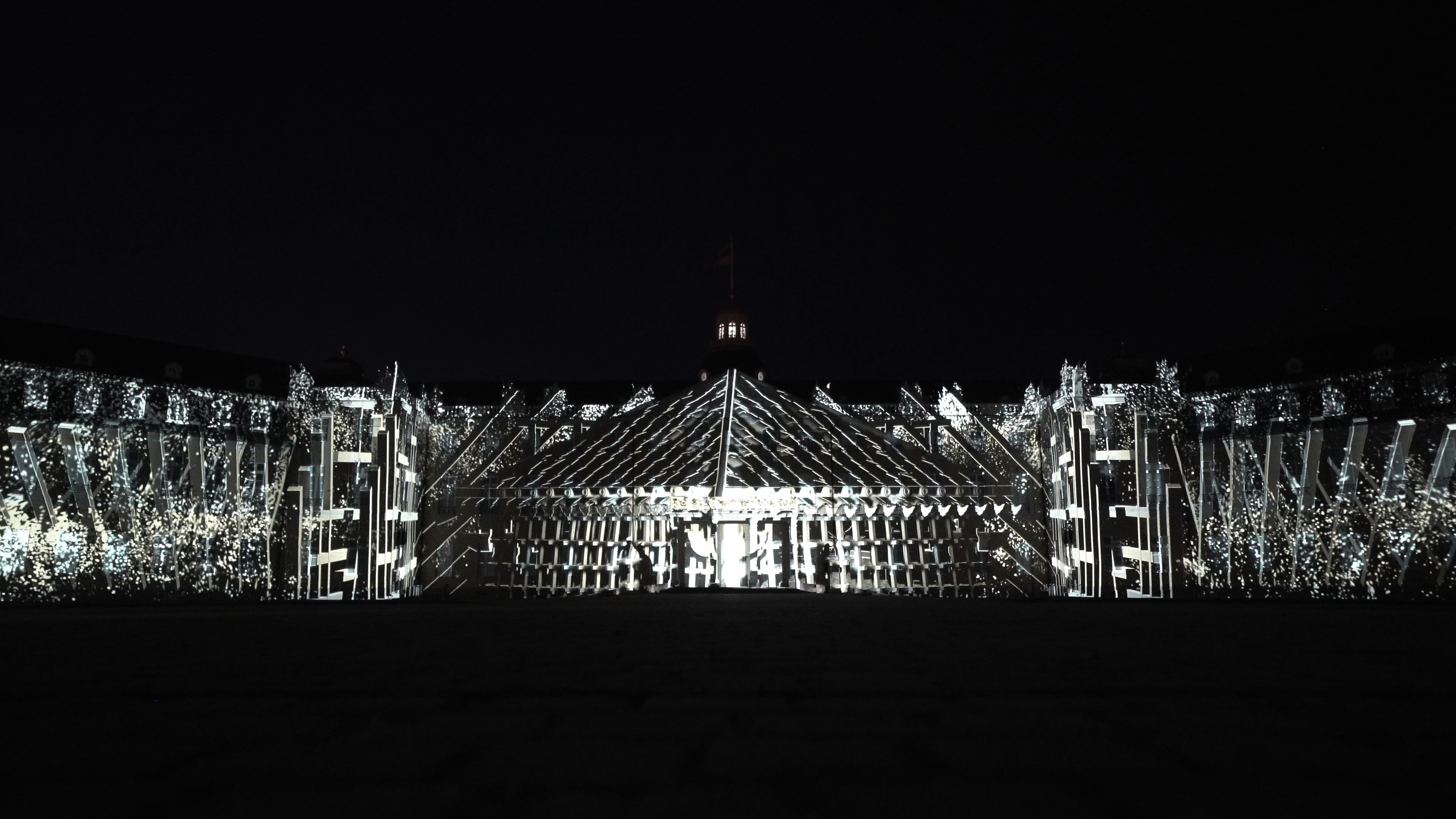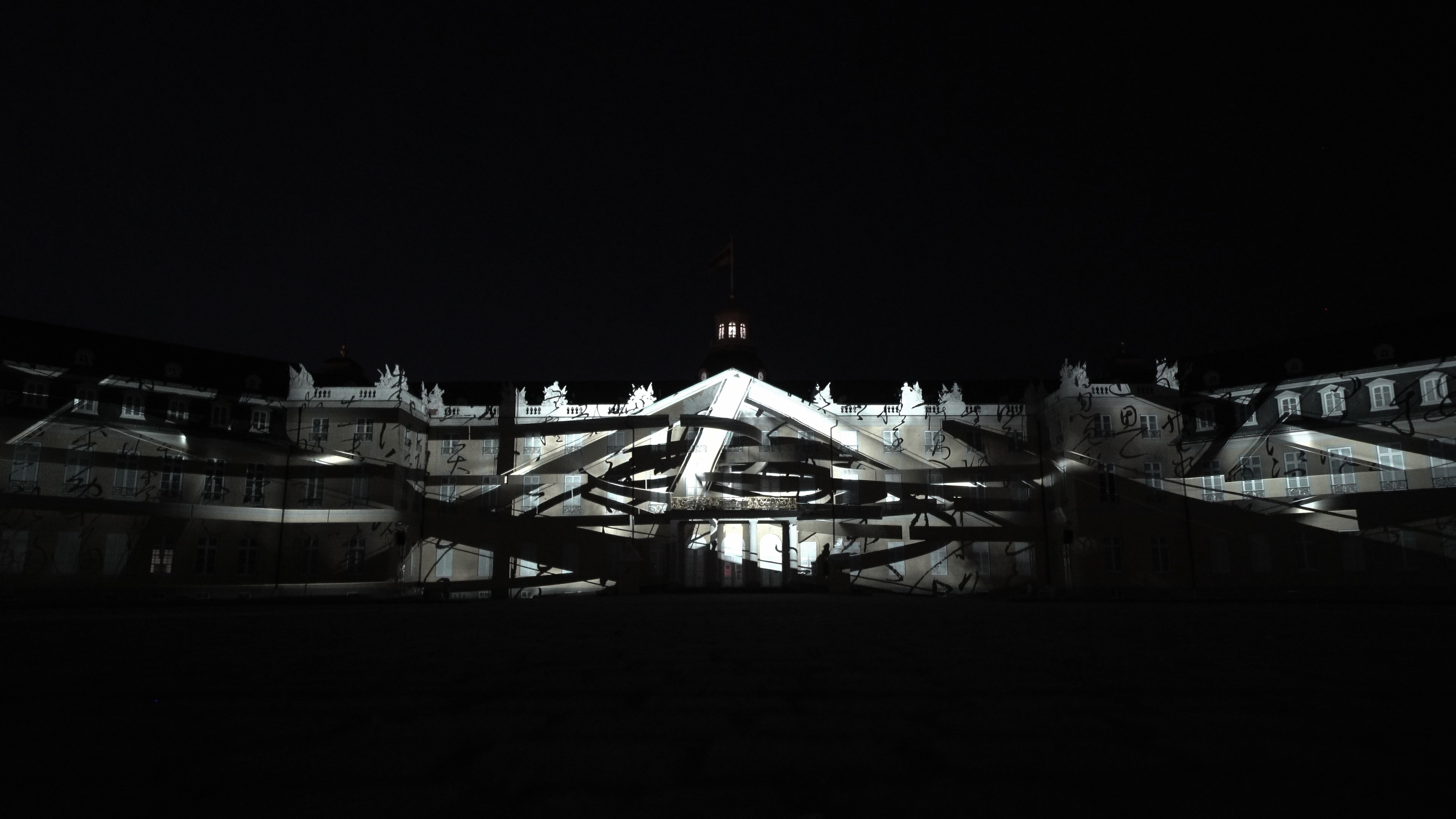 This artwork was exhibited in 2025 at the Schlosslichtspiele in Karlsruhe, Germany, organized by ZKM, under the title The Tao · The Flow of Universe. Rooted in the visual foundation of ink painting, it merges the Tao from Eastern philosophy with the rational logic of Western modern science, seeking to establish a new form of visual narrative. The blankness and fluidity of ink are used as metaphors for cosmic operation and scientific evolution, unfolding imagery of time, energy, and the cycle of life.The design employs large amounts of abstract particle structures, vortex lines, and waveforms, symbolizing scientific concepts such as the quantum world, gravitational waves, and energy fields. Black and gold collisions, folded arcs, and rotating totems in the visuals respond to modern physics` exploration of the structure of the universe. These images are not mechanical reproductions of real scientific devices but a perception of their existence and logic through the sensibility of Eastern ink painting, interpreting rigid knowledge with flexible brushstrokes.The structure of the artwork follows the principles of symmetry, disruption, and recomposition, echoing the cyclical system of Tao Follows Nature. In the architectural mapping, patterns of circuit boards, the form of Taiji, and celestial trajectories are revealed and resonate with the silhouette of Karlsruhe Palace, blending traditional space with a technological context.In visual language, the artwork draws inspiration from the essence of masters Qi Baishi and Wu Guanzhong, while also referencing the abstract systems of Kandinsky and Mondrian. At the same time, it preserves the brush logic of Eastern calligraphy, water textures, and drifting clouds, allowing the coldness of technology and the poetry of the East to mirror each other within the same frame. Through this artwork, we aim to bridge ink painting and technology, Eastern philosophy and Western science, transforming architecture into a cross-cultural and cross-temporal visual laboratory.